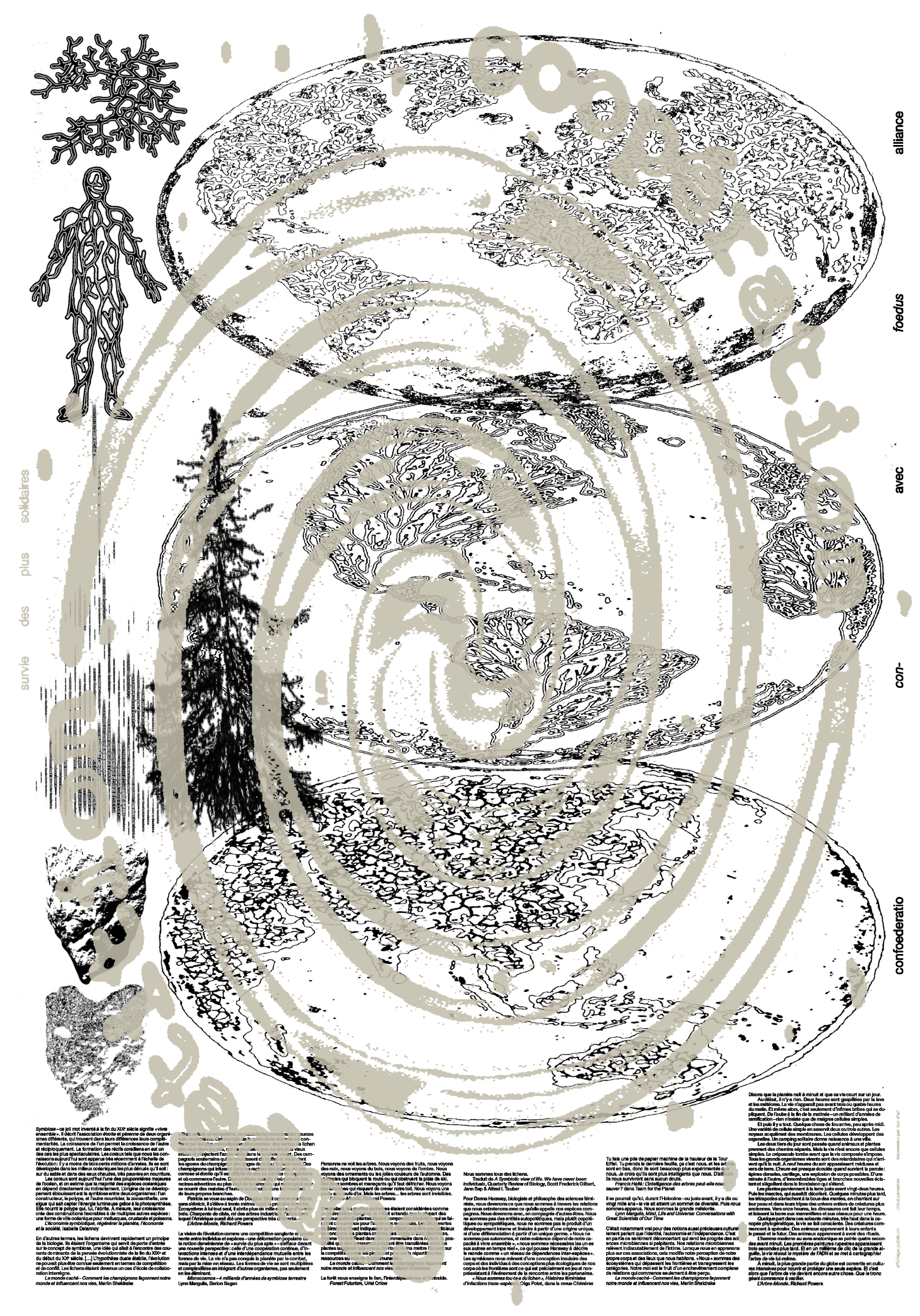 ENThe poster explores the theme of ‘confoederatio’ by returning to its etymological meaning: con- (“with”) and foedus (‘alliance’). It seeks to overturn the widely held belief that evolution on Earth is the result of relentless struggle, subject to the law of the strongest – a view that has been challenged by numerous scientific studies which rehabilitate cooperation as an essential driver of evolution. Many forms of life have indeed emerged from partnerships that are essential to their survival; they teach us about ‘living together’ and invite us to take a more accurate look at our place in an interdependent whole. The poster brings together excerpts from scientific and philosophical texts that cover the many forms of mutual aid found in nature – inter-kingdom symbiosis, resource sharing, cooperative networks, etc. – to the point of questioning the very notion of the individual. The texts are complemented by experimental representations of these concepts, which invite us to question our relationship with living beings, resources and struggle.